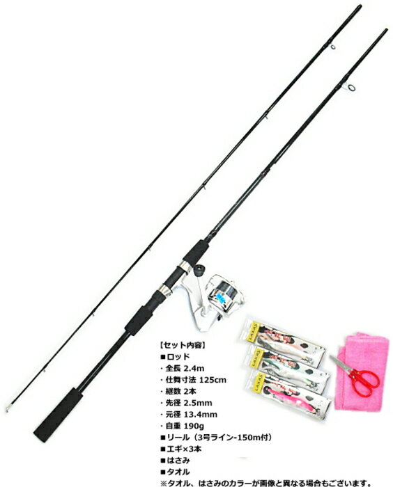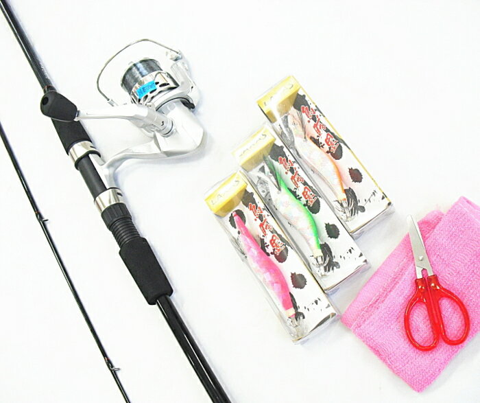 ■お買い物の前にご確認ください ⇒ 在庫表示/配送/送料等のご説明他のお買い得セット商品を見る商品情報Tryitem スマイルセット エギング 80 / エギングロッド&リール&餌木 エギング入門セットすぐに使える!セットで楽々エギングセットでアオリイカ釣りに出かけよう!【セット内容】■ロッド・全長 2.4m・仕舞寸法 125cm・継数 2本・先径 2.5mm・元径 13.4mm・自重 190g■リール(3号ライン-150m付)■エギ×3本■はさみ■タオル※タオル、はさみのカラーが画像と異なる場合もございます。