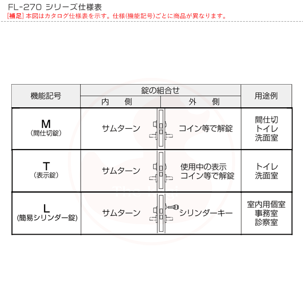 (受注品など事前確認対応外の商品有) BEST フレンドレバー鎌錠 簡易シリンダー FL-270L 商品詳細 仕様(機能記号) 簡易シリンダー錠(L) 付属キー本数 2本 対応扉厚(DT) 30mm〜36mm バックセット(BS) 38mm, 51mm 主な材質 亜鉛 商品内容参考 丸座, ケース, 受座, 留めネジ メンテナンス メンテナンス潤滑剤はこちら 備考 室内引き戸 ※メーカー都合(製品改良等)により、外観・デザイン等の一部仕様は予告無く変更されている場合があります。