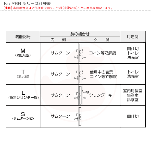 (受注品など事前確認対応外の商品有) BEST 角型鎌錠 簡易シリンダー No.266L BS50mm仕様 商品詳細 仕様(機能記号) 簡易シリンダー錠(L) 付属キー本数 3本 対応扉厚(DT) 30mm〜33mm, 36mm〜40mm バックセット(BS) 50mm 主な材質 ステンレス+亜鉛 商品内容参考 角座, ケース, 受座, 留めネジ メンテナンス メンテナンス潤滑剤はこちら 備考 室内引き戸 ※メーカー都合(製品改良等)により、外観・デザイン等の一部仕様は予告無く変更されている場合があります。